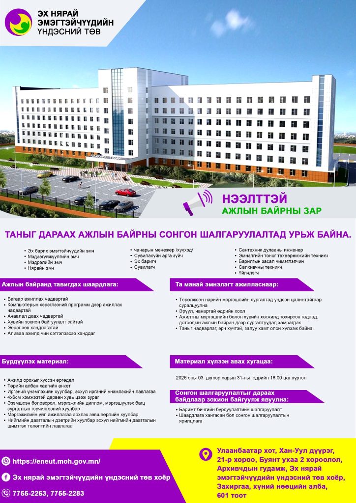 ТАНЫГ НЭЭЛТТЭЙ АЖЛЫН БАЙРАНД УРЬЖ БАЙНА.https://eneut.moh.gov.mn/Posted on: 10 Mar 2026 Previous Авлигатай тэмцэх газрын гомдол мэдээлэл хүлээн авах 110 дугаар өөрчлөгдөн 11-10 боллоо.Next Эх нярай, эмэгтэйчүүдийн үндэсний төвийн Эх барих, эмэгтэйчүүдийн эмнэлгийн захирал, Хүний гавьяат эмч Ж.Оюунцэцэг Skip back to main navigation