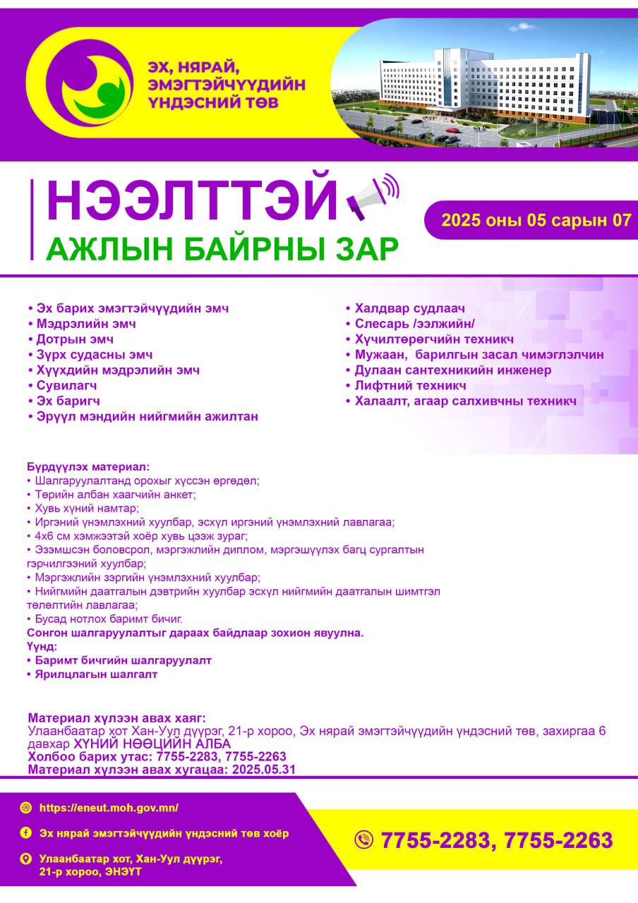 Нээлттэй ажлын байрны зар – 2025 оны 5-р сарын 7