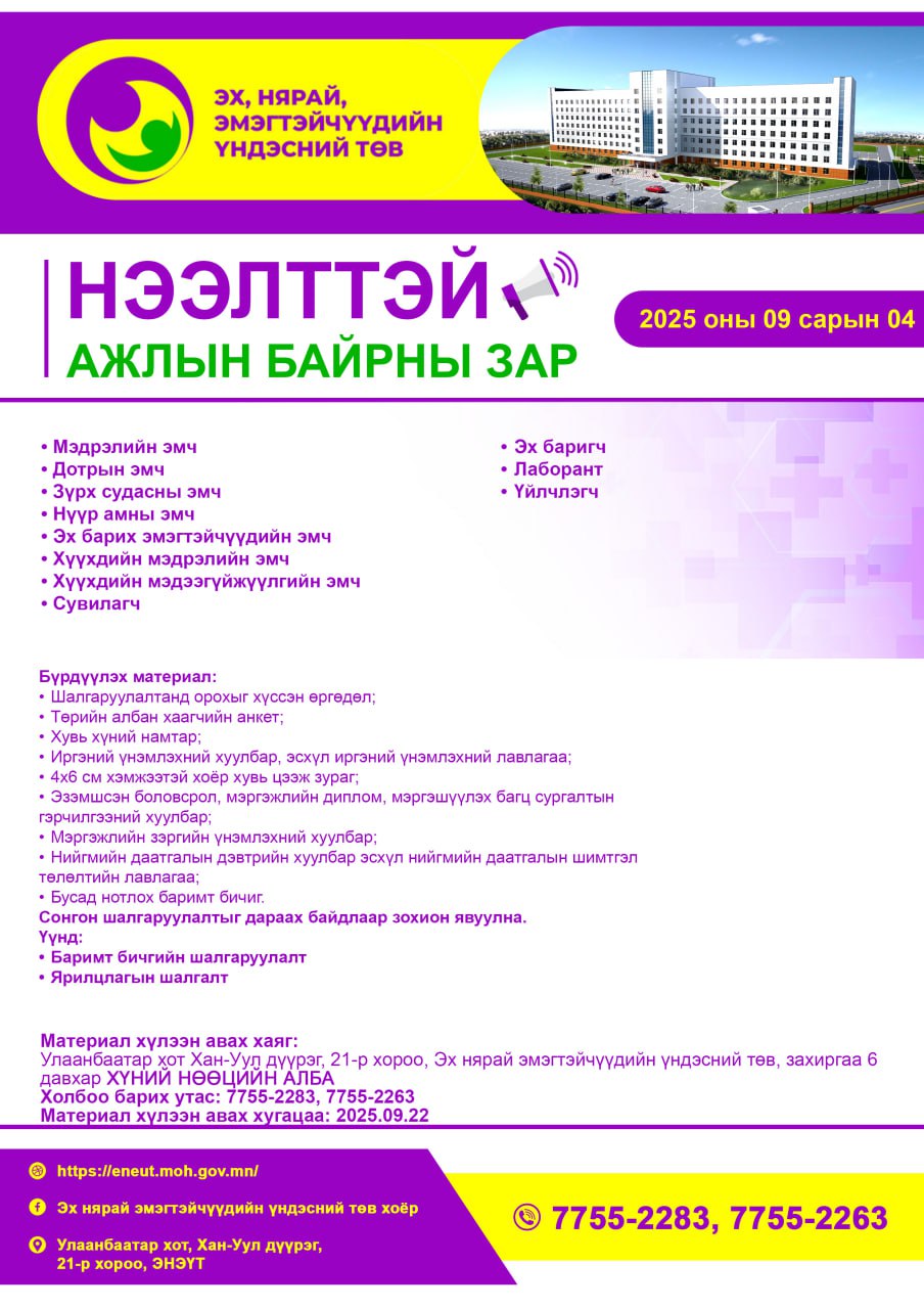 Нээлттэй ажлын байрны зар – 2025 оны 9-р сарын 4